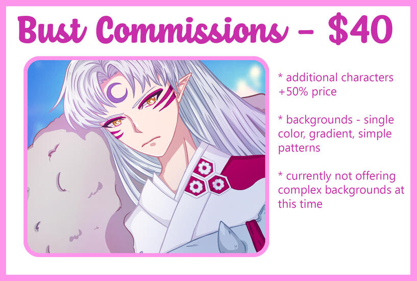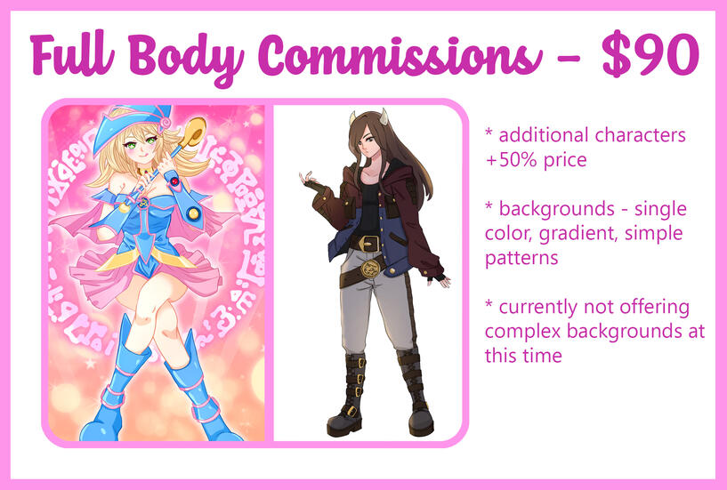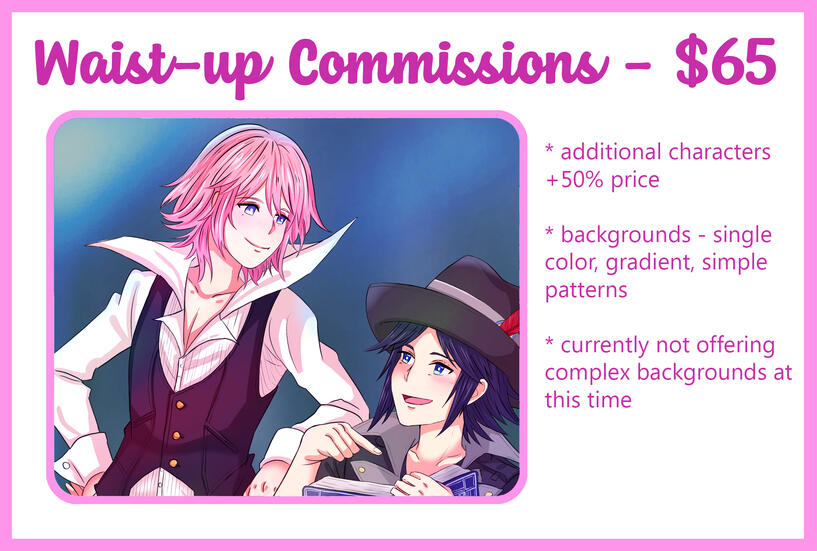 ♥ I hold the right to accept or decline any request.♥ All payments will be accepted through Paypal only.♥ All commissions must be paid for in their entirety upfront.♥ You are required to provide me with reference images.♥ I will send you the sketch when I am done with it, and you may ask for any changes at that point. Once I have progressed past the sketch you may no longer request any changes.♥ Completing your commission may take from 2 weeks to a month. I work a full time job and don’t always have the time to draw every day.♥ By requesting a commission you are agreeing that you will only use the illustration for personal uses and will not resell it and claim it as your own work.♥ I may post a watermarked version of the illustration on my Twitter and Instagram unless otherwise requested.♥ You are more than welcome to post the finished commission online, please remember to credit me in the post!♥ By requesting you are agreeing to have read and accepted all terms and conditions listed above.